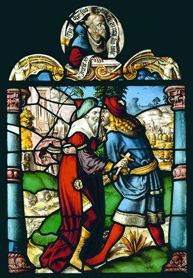 8-10ст. «И когда они были близ большого камня, что у Гаваона, то встретился с ними Амессай. Иоав был одет в воинское одеяние свое и препоясан мечом, который висел при бедре в ножнах и который легко выходил из них и входил. И сказал Иоав Амессаю: здоров ли ты, брат мой? И взял Иоав правою рукою Амессая за бороду, чтобы поцеловать его. Амессай же не остерегся меча, бывшего в руке Иоава, и тот поразил его им в живот, так что выпали внутренности его на землю, и не повторил ему удара, и он умер. Иоав и Авесса, брат его, погнались за Савеем, сыном Бихри» (2Цар.20:8-10).