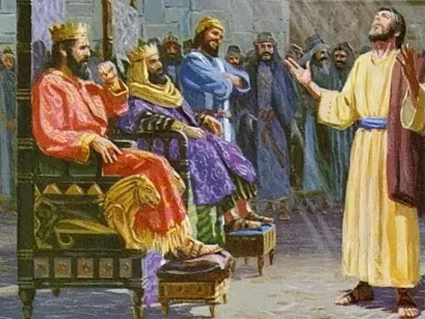35-43ст. «Тогда один человек из сынов пророческих сказал другому, по слову Господа: бей меня. Но этот человек не согласился бить его. И сказал ему: за то, что ты не слушаешь гласа Господня, убьет тебя лев, когда пойдешь от меня. Он пошел от него, и лев, встретив его, убил его. И нашел он другого человека, и сказал: бей меня. Этот человек бил его до того, что изранил побоями. И пошел пророк и предстал пред царя на дороге, прикрыв покрывалом глаза свои. Когда царь проезжал мимо, он закричал царю и сказал: раб твой ходил на сражение, и вот, один человек, отошедший в сторону, подвел ко мне человека и сказал: "стереги этого человека; если его не станет, то твоя душа будет за его душу, или ты должен будешь отвесить талант серебра". Когда раб твой занялся теми и другими делами, его не стало. – И сказал ему царь Израильский: таков тебе и приговор, ты сам решил. Он тотчас снял покрывало с глаз своих, и узнал его царь, что он из пророков. И сказал ему: так говорит Господь: за то, что ты выпустил из рук твоих человека, заклятого Мною, душа твоя будет вместо его души, народ твой вместо его народа. И отправился царь Израильский домой встревоженный и огорченный, и прибыл в Самарию» (3Цар.20:35-43).