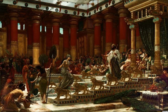 Дом Божий строился семь лет, а дворцовый комплекс строился почти вдвое дольше, тринадцать лет. Но и по размеру он был больше дома Божьего, так как это был не просто дворец Соломона, но и целый комплекс дворцовых зданий, которые были соединены между собой коридорами, переходами. Дворец был трехэтажный, трехъярусный с множеством комнат. Строил Соломон свой дворец так, чтобы он превосходил все дворцы других народов по своей архитектуре и роскоши. В постройке дворца Соломон употреблял не только ливанское дерево, но и драгоценные камни, то есть мрамор, который привозил из других стран. Камни эти были хорошо обработаны и украшены орнаментами. Мраморными камнями возводились и наружные стены дворца, и в их облицовку были вставлены украшения из кипарисового, красного, пальмового и других пород деревьев. Такие украшения в Библии названы «дщидцами». И внутренние стены Соломон также выложил разноцветными деревьями, с преобладанием красного дерева и кедра. И на них были вырезаны орнаменты. В общем, дворец смотрелся роскошно, блистал своим великолепием. Как пишет Иосиф Флавий, дворец был построен не на горе Мориа, где храм, а на горе Сионе, в верхнем городе, и соединялся дворец с храмом искусственным мостом. На все эти постройки у Соломона ушло 20 лет.