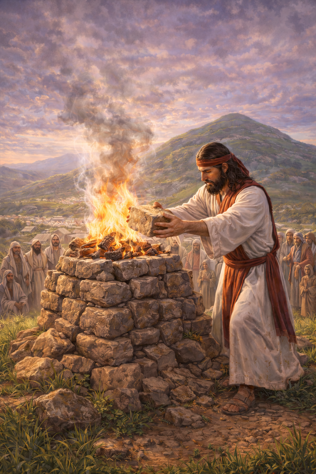 Вот Иисус и весь народ пришли к тому месту, о котором завещал Моисей – это две смежные горы: одна – Гевал, или же Эйвал, означающая безжизненную, сухую, лысую гору. На ней Иисус Навин, по наказу Моисея, выстроил жертвенник из нетесаных камней. В 1982году молодой археолог Адам Зартель обнаружил это сооружение, даже не поняв поначалу, что это – тот самый жертвенник. Но дальнейшие раскопки показали, что на этом жертвеннике приносились жертвы именно жертвенных животных несколько столетий, вероятно, даже вплоть до построения Иерусалимского Храма.