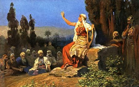 8-10ст. «Избрали новых богов, от того война у ворот. Виден ли был щит и копье у сорока тысяч Израиля? Сердце мое к вам, начальники Израилевы, к ревнителям в народе; прославьте Господа! Ездящие на ослицах белых, сидящие на коврах и ходящие по дороге, пойте песнь!» (Суд.5:8-10).