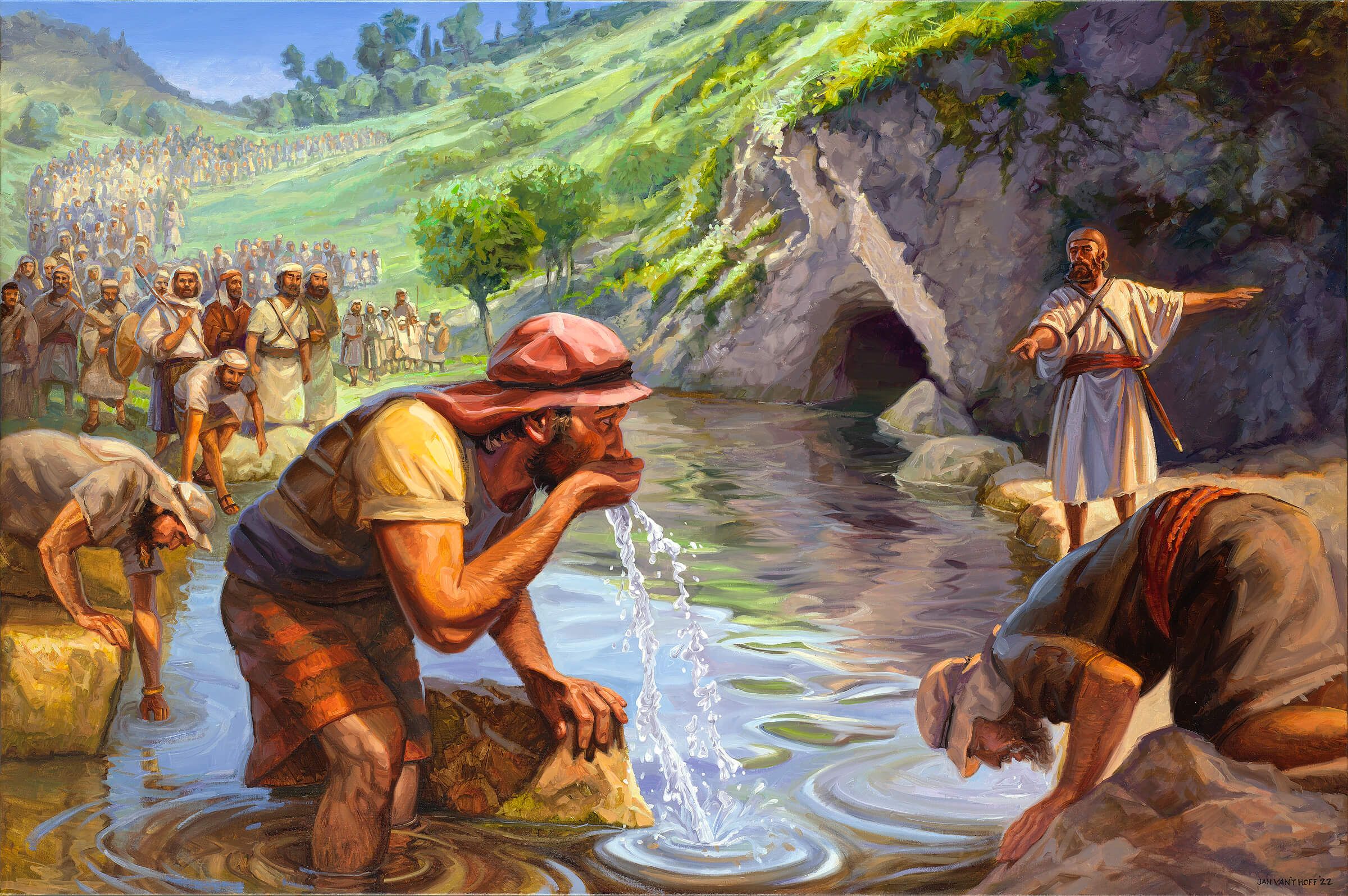 5-8ст. «Он привел народ к воде. И сказал Господь Гедеону: кто будет лакать воду языком своим, как лакает пес, того ставь особо, также и тех всех, которые будут наклоняться на колени свои и пить. И было число лакавших ртом своим с руки триста человек; весь же остальной народ наклонялся на колени свои пить воду. И сказал Господь Гедеону: тремя стами лакавших Я спасу вас и предам Мадианитян в руки ваши, а весь народ пусть идет, каждый в свое место. И взяли они съестной запас у народа себе и трубы их, и отпустил Гедеон всех Израильтян по шатрам и удержал у себя триста человек; стан же Мадиамский был у него внизу в долине» (Суд.7:5-8).