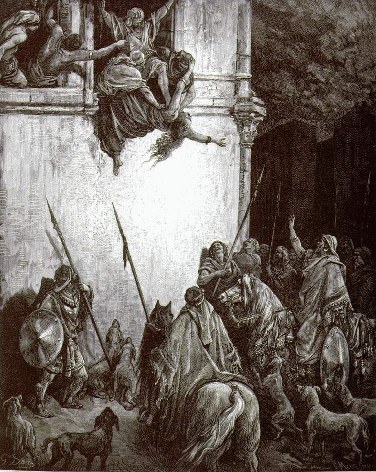 Когда Ииуй прибыл в Изреель и вошел в ворота города, Иезавель, уже получив известие о случившемся, ожидала его у окна своего дворца. Она привела себя в порядок, хотя понимала, что ее ожидает казнь. Но, несмотря на это, она нарумянила себя, украсила свою голову, очевидно, венцом. Это показывает, насколько она была сильной натурой, небоязливой, и даже умирала с достоинством. И вот она встретила Ииуя с насмешкой, назвав его Замврием, намекая на то, что он – раб и убийца царя, как и некогда Замврий, и что его ожидает то же, что и того: «И составил против него заговор раб его Замврий, начальствовавший над половиною колесниц. Когда он в Фирце напился допьяна в доме Арсы, начальствующего над дворцом в Фирце, тогда вошел Замврий, поразил его и умертвил его, в двадцать седьмой год Асы, царя Иудейского, и воцарился вместо него» (3Цар.16:9,10). Несмотря на то, что Замврий истребил весь дом Ваасы по слову Господа, процарствовал он всего лишь семь дней: «В двадцать седьмой год Асы, царя Иудейского, воцарился Замврий и царствовал семь дней в Фирце, когда народ осаждал Гавафон Филистимский» (3Цар.16:15). Вот с какой насмешкой встретила его Иезавель. Но Ииуй не обратил внимания на ее слова, а воззвал к служащим при Иезавели, сказав, что тот, кто с ним, пусть выбросит ее из окна. Отозвались два, три евнуха, которые прислуживали в то время Иезавели, и выбросили ее из окна. Они хорошо понимали, что власть поменялась, и если они не примут сторону Илиуя, то с ними будет то же, что и с бывшим царем. И как было сказано о ней в пророчестве через Илию, тело ее съедят псы: «И поступлю с домом твоим так, как поступил Я с домом Иеровоама, сына Наватова, и с домом Ваасы, сына Ахиина, за оскорбление, которым ты раздражил Меня и ввел Израиля в грех. Также и о Иезавели сказал Господь: псы съедят Иезавель за стеною Изрееля» (3Цар.21:22,23). И тогда, когда Ииуй немного отдохнул после похода и сражения и подкрепился, решил похоронить Иезавель, ведь все же она была царских кровей, но не нашли ее, кроме того, что от нее осталось: «...кроме черепа, и ног, и кистей рук». И тогда он вспомнил, что о ней так и было сказано через Илию, пророка Божьего.